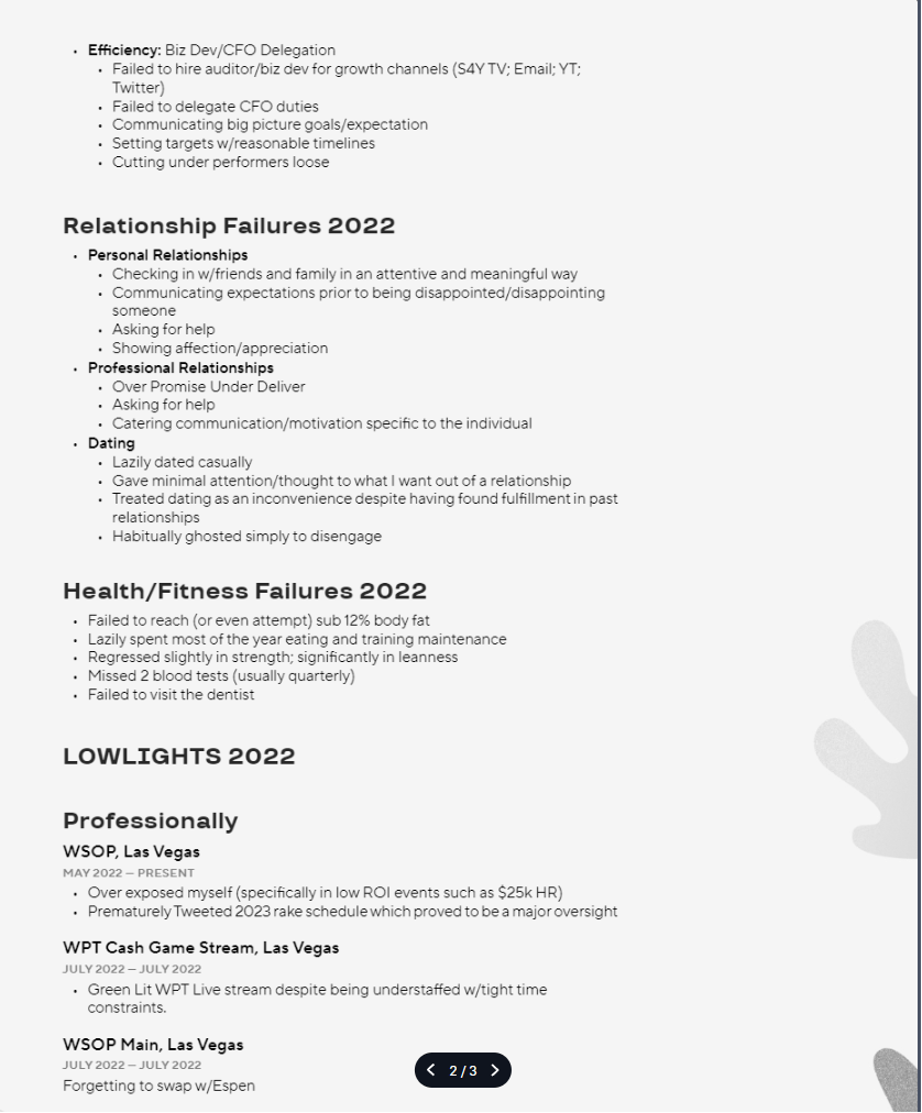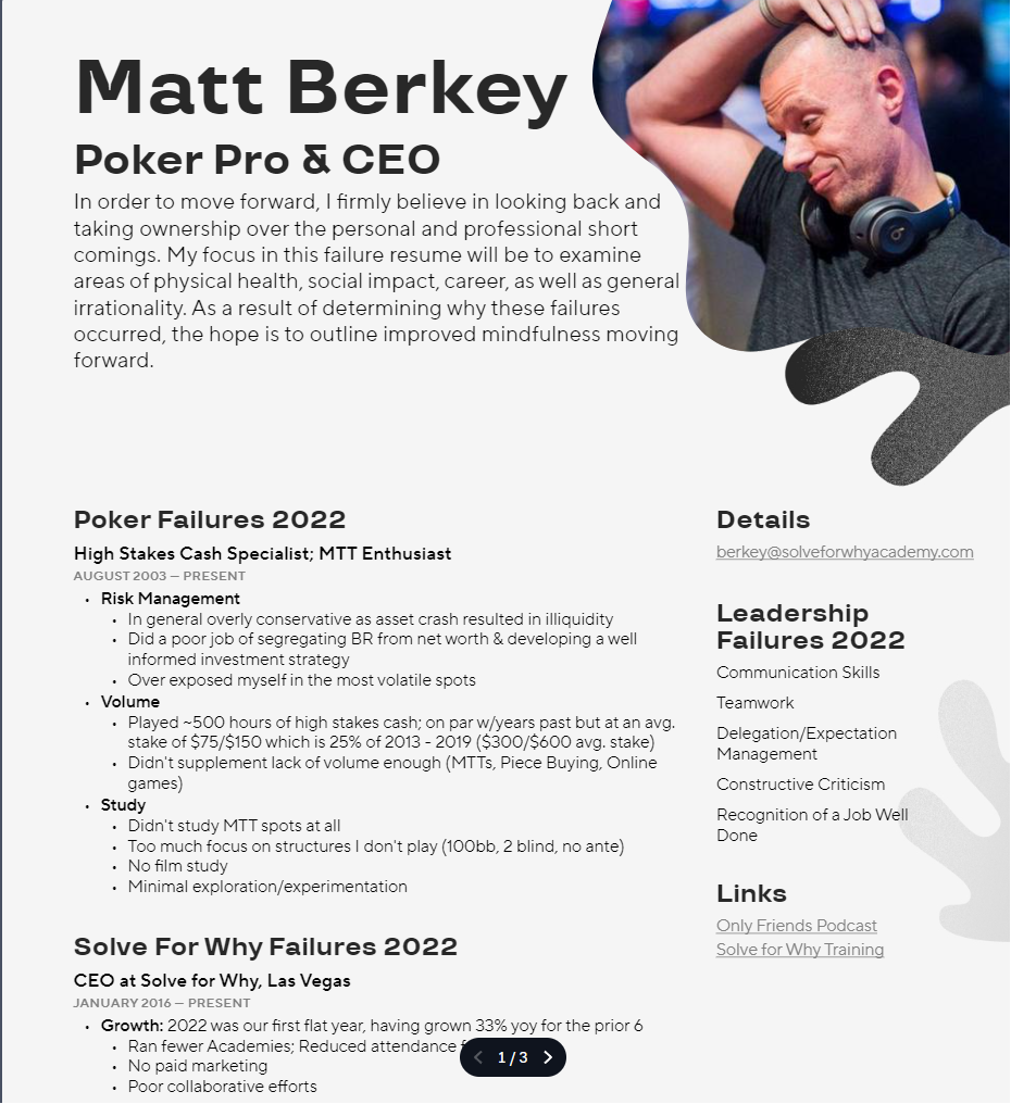 Fortunately, I chose a career path that has a humbling mechanism built in. Dealing with, and learning from, failure is a prerequisite to pursuing poker in any sort of serious way. It’s only natural that as I transition from a young, pie-eyed, anything is possible twenty-something into a grizzled, battle tested forty year old, so too does my year end process evolve. Doing the hard work meant looking back on the hurdles and missteps with an objective eye and taking ownership over past failings, ultimately compiling a failure resume of sorts. In the past this was something I just journaled, as it was heavily skewed toward personal short comings, character flaws & failures among interpersonal relationships. I still have plenty of failures to highlight in those areas, but I’ve done enough work to where I don’t feel exposed by identifying my missteps and creating a corrective course of action.